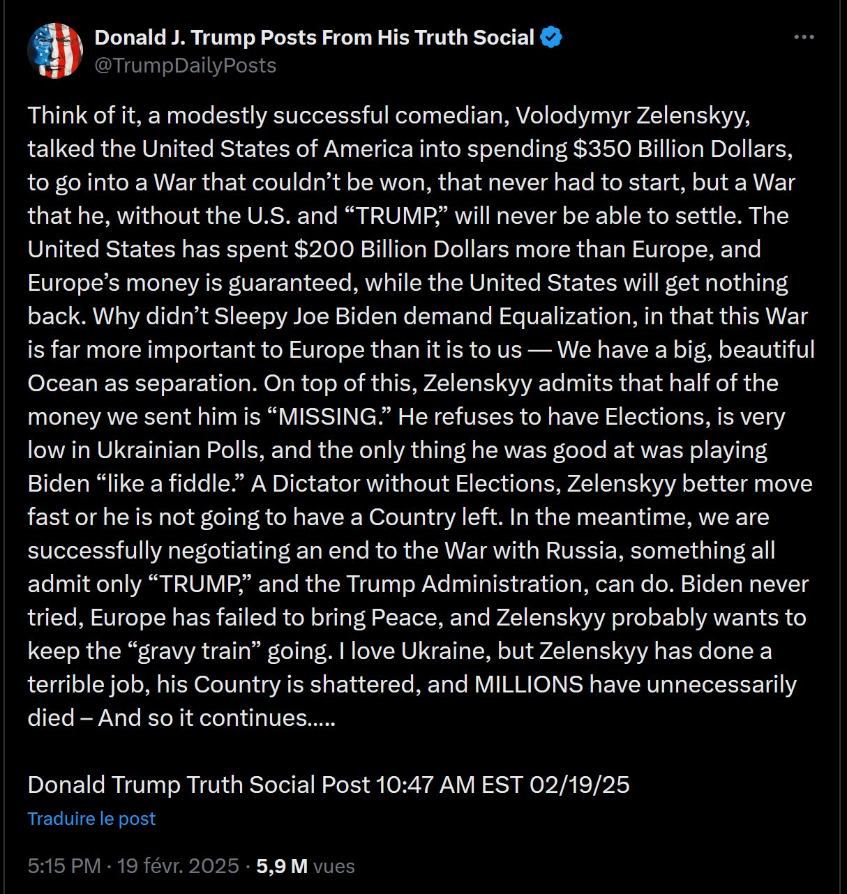 “Pensez-y, un comédien au succès modeste, Volodymyr Zelensky, a convaincu les États-Unis de dépenser 350 milliards de dollars pour entrer dans une guerre qui ne pouvait être gagnée, qui n’avait jamais dû commencer, mais une guerre qu’il ne pourra jamais terminer sans les États-Unis et « TRUMP ». Les États-Unis ont dépensé 200 milliards de dollars de plus que l’Europe, et l’argent de l’Europe est garanti, tandis que les États-Unis ne récupéreront rien. Pourquoi Joe Biden n’a-t-il pas exigé une péréquation, dans la mesure où cette guerre est bien plus importante pour l’Europe que pour nous — nous avons un grand et magnifique océan pour nous séparer. En plus de cela, Zelensky admet que la moitié de l’argent que nous lui avons envoyé a « DISPARU ». Il refuse d’organiser des élections, est très bas dans les sondages ukrainiens, et la seule chose pour laquelle il était doué était de manipuler habilement Biden. Un dictateur sans élections, Zelensky ferait mieux d’agir vite ou il n’aura plus de pays. En attendant, nous négocions avec succès la fin de la guerre avec la Russie, ce que tout le monde admet que seul « TRUMP » et l’administration Trump peuvent faire. Biden n’a jamais essayé, l’Europe n’a pas réussi à ramener la paix et Zelensky veut probablement continuer à profiter de la situation. J’aime l’Ukraine, mais Zelensky a fait un travail épouvantable, son pays est en ruines et des MILLIONS de personnes sont mortes inutilement — et cela continue…”